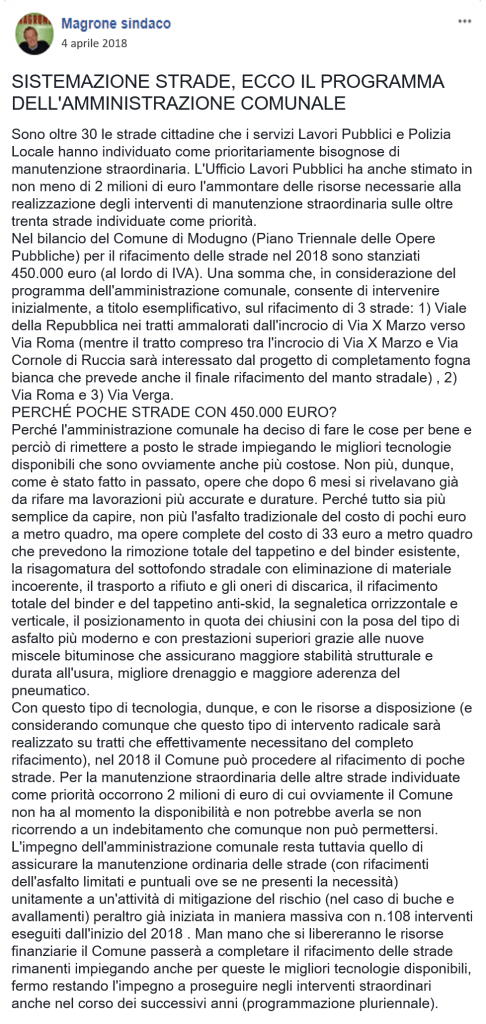 Come associazione “Modugno A 5 Stelle” lo avevamo già chiesto al Commissario Prefettizio e ci indicarono una delibera di giunta di 6 mesi prima, che non abbiamo avuto modo di verificare.